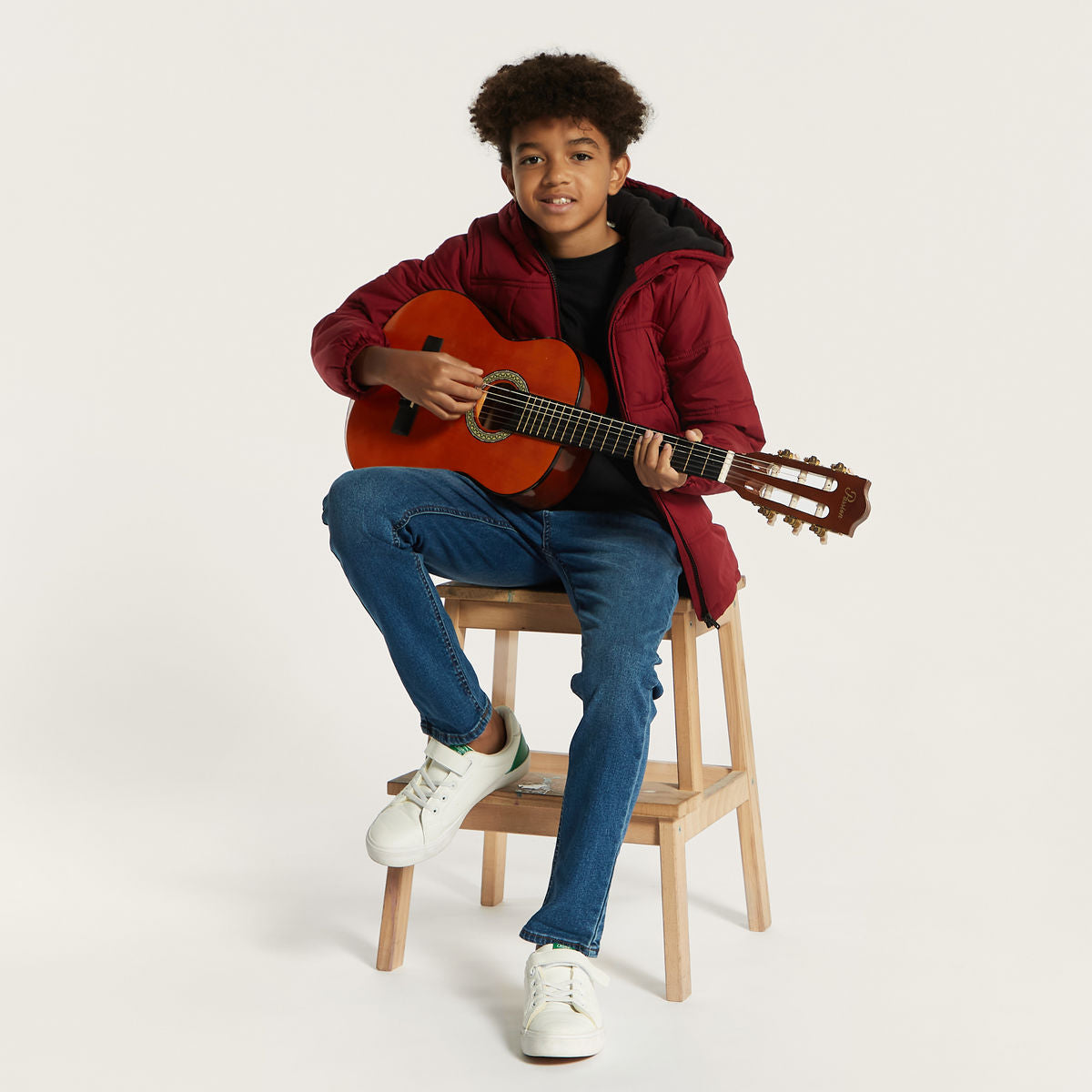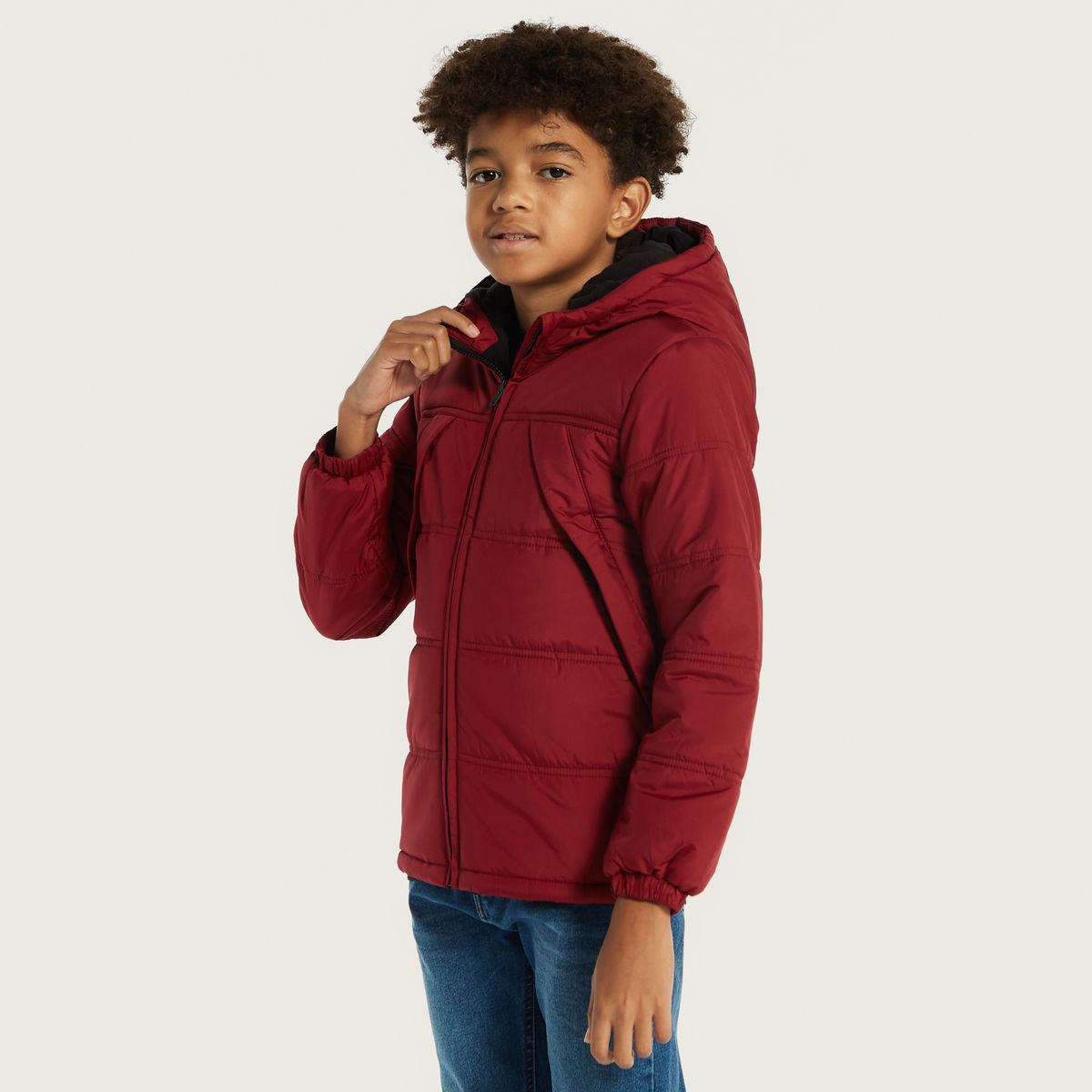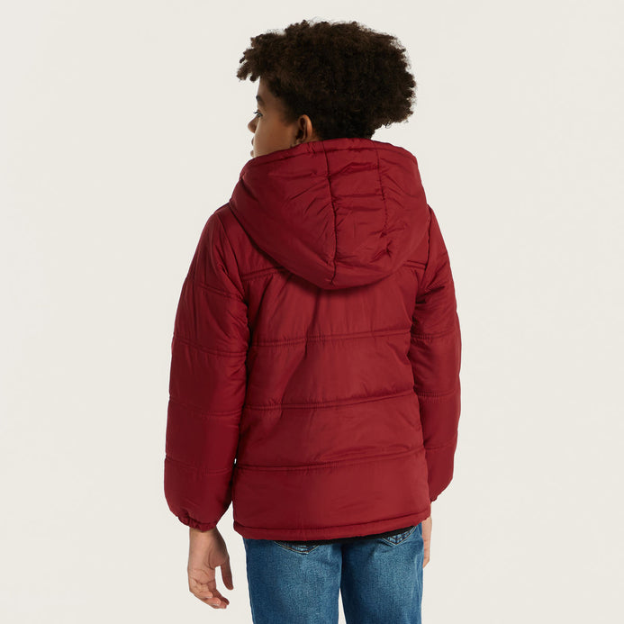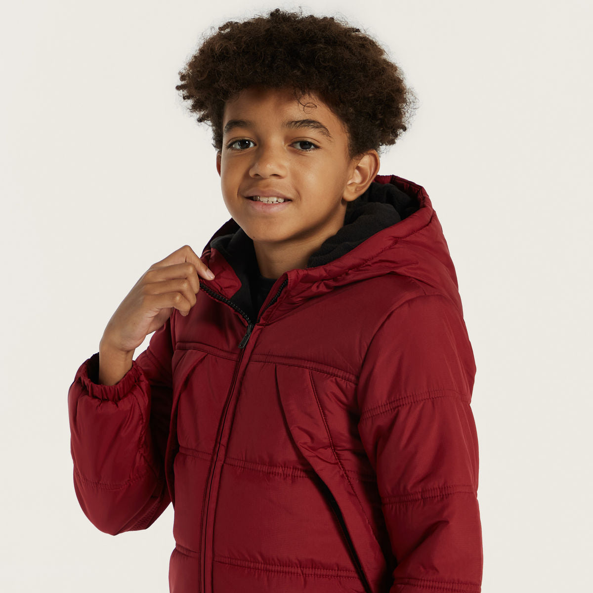 Accentuated with a solid tone and quilted pattern, this padded jacket with ribbed cuffs is designed to offer extra warmth and wind protection. Crafted from quality material with zip guards, this trendy pick is showerproof and is a must-have in your kid's outerwear collection.