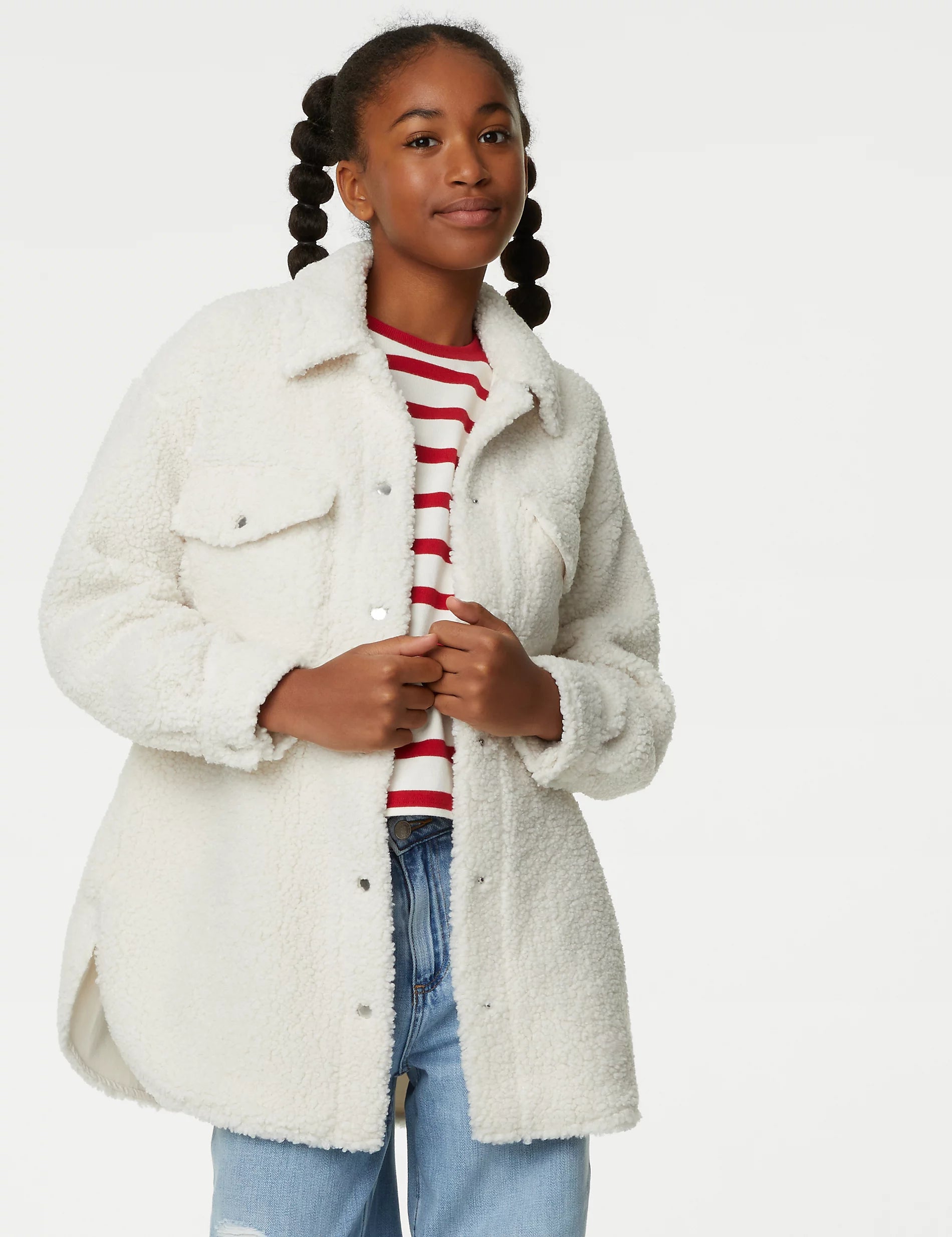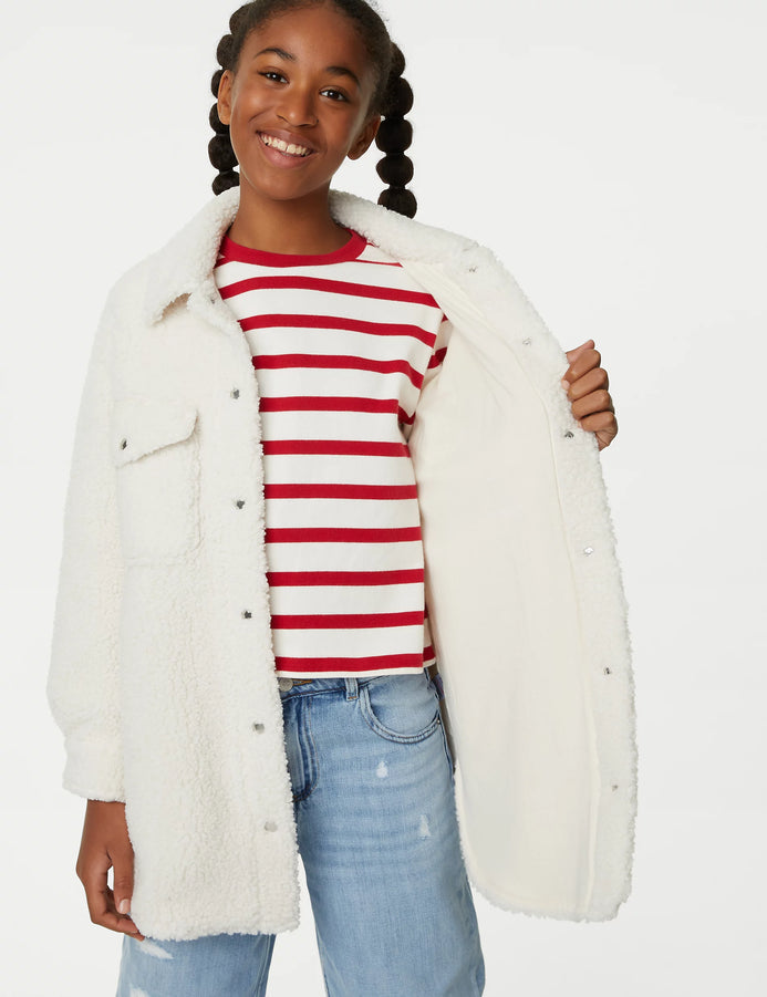 Keep kids snug in style with this cool longline shacket. It's made to a comfy regular fit from soft, fluffy borg and is lined for extra warmth. The popper fastenings ensure it's quick and easy to slip on and off. A pair of chest pockets keeps personal items safe and close to hand.