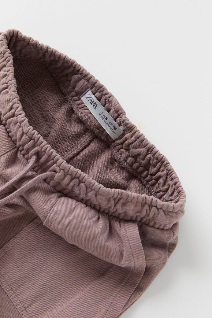 PLUSH TROUSERS WITH AN ELASTIC WAISTBAND AND ADJUSTABLE DRAWSTRINGS. FEATURING FRONT PATCH POCKETS, FALSE BACK FLAP POCKETS WITH SNAP BUTTON APPLIQUÉS, ZIP FASTENING AT THE HEM, CUFFED HEMS AND A CONTRAST LABEL APPLIQUÉ.