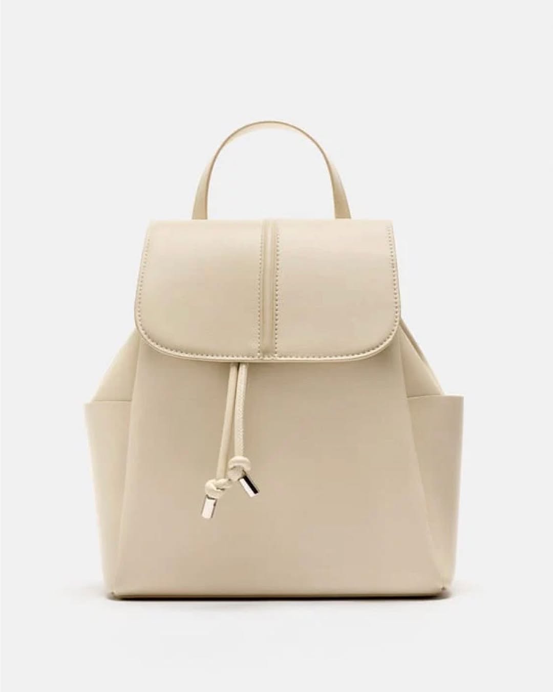 Backpack with side pockets. Gathered drawstring closure and magnetic clasp on the flap. Adjustable shoulder straps and top handle.