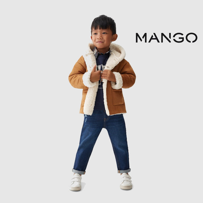 Suedette fabric. Straight design. Medium design. Rounded neck. Hood. Long sleeve. Two side patch pockets. Faux shearling interior. Button fastening on the front section. Internal label for personal data.