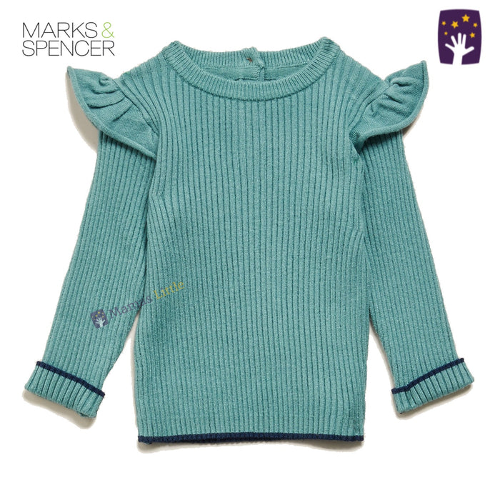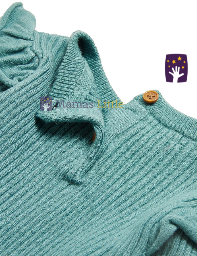 This soft knitted outfit will keep your little one warm and cosy on days out. Outfit includes a long-sleeved ribbed top with playful shoulder . Both feature rolled-up cuffs and contrast colour hems. Back buttons on the top for easy dressing.