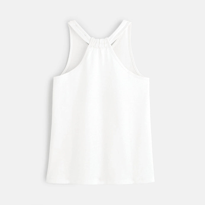 Tank top for girls. Soft cotton jersey. Flared fit. Round scoop neckline. Racerback. Message in print and patch in front. Straight hem. Small Okaïdi label.