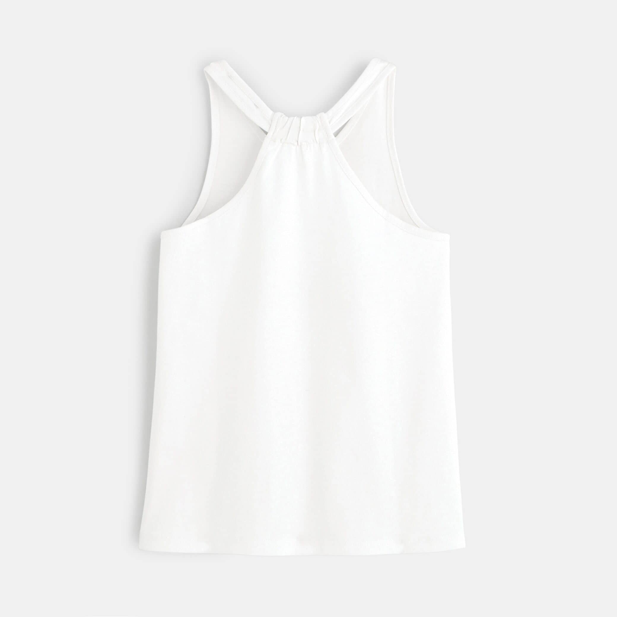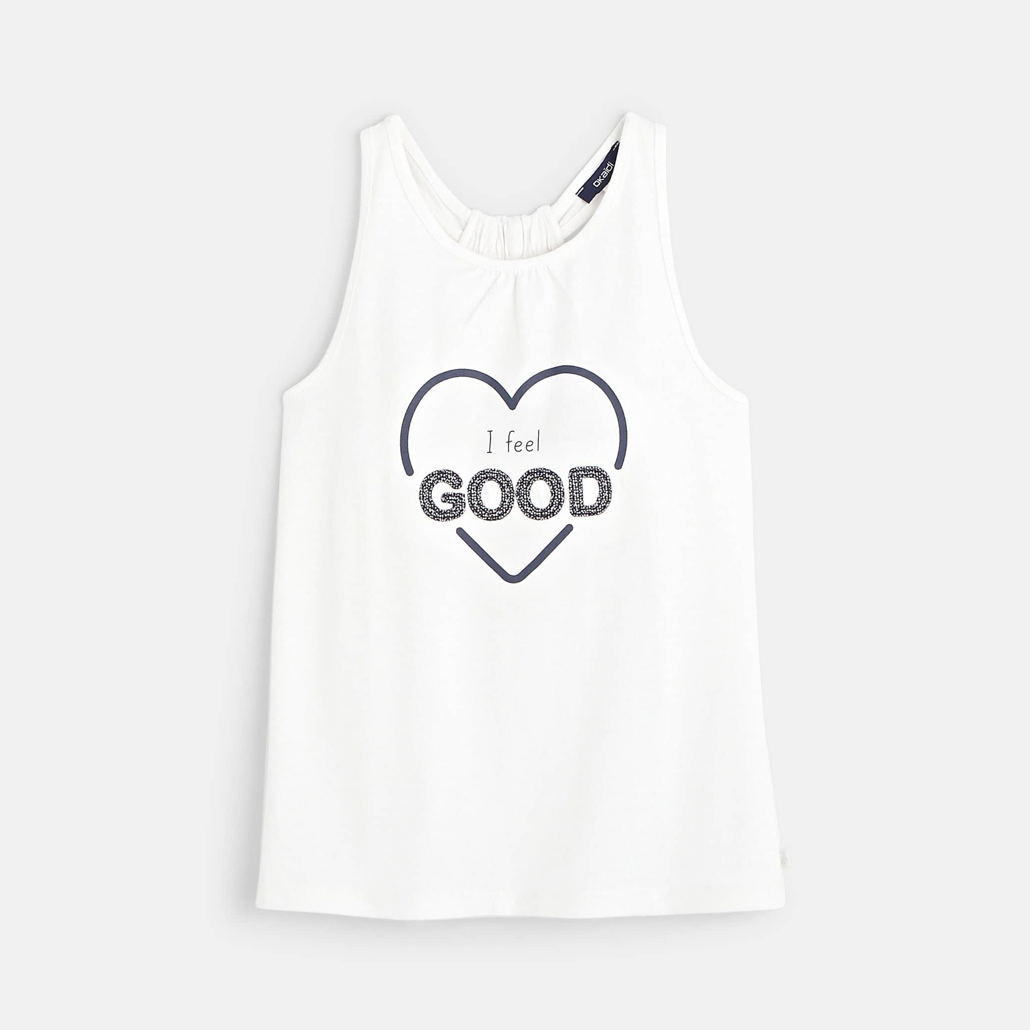 Tank top for girls. Soft cotton jersey. Flared fit. Round scoop neckline. Racerback. Message in print and patch in front. Straight hem. Small Okaïdi label.