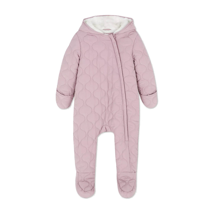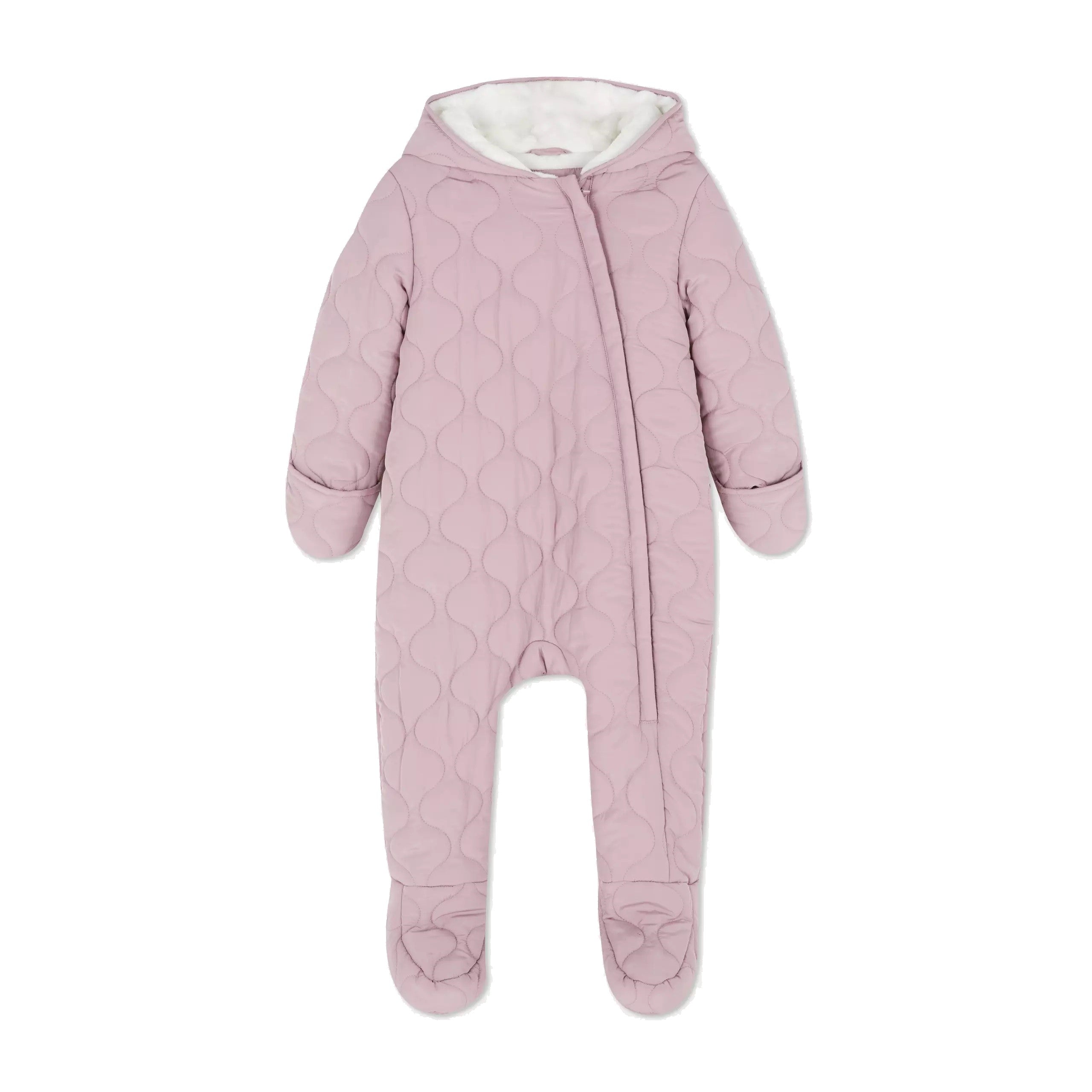 *Please check size chart before Placing order ( Inches )Get them cooler day ready with this all-in-one snuggle suitWarmly padded, this cosy pramsuit will keep your little one snug and warm when you head outdoors.Prepare for extra chilly days, home or away, with this adorable, pink quilted pramsuit. The zip-up design makes it simple to fasten plus the covered feet, fold-over hand flaps and fluffy lined hood help to lock in warmth. We love the wavy quilted design and subtle pink colour — totally stylish! If you’re heading somewhere cold with them for the weekend, make sure you don’t pass on this sweet all-in-one. Outwear Sleeve Length: Full length Fastening: Zip; N/A; Material Composition: 100% Polyester Pattern: Solid colour Fire Safety: WARNING! Keep away from fire; Maximum Temperature 40*C; Cool Iron; Do not bleach; Tumble dry normal drying cycle; Do not dry-clean; Wash before first use; Wash similar colours together; Wash Inside Out; |