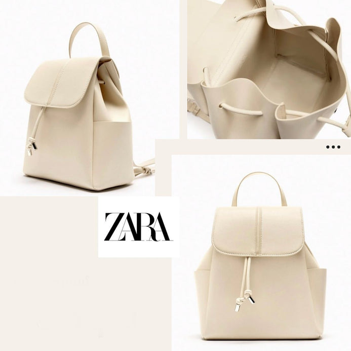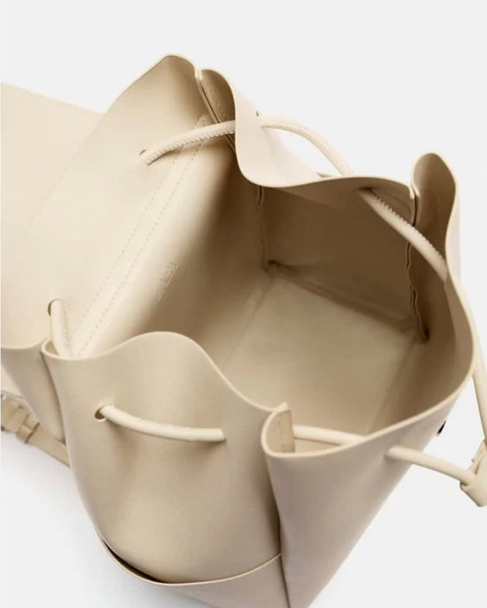 Backpack with side pockets. Gathered drawstring closure and magnetic clasp on the flap. Adjustable shoulder straps and top handle.